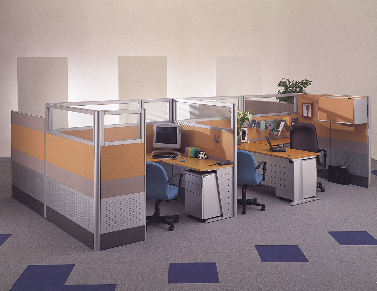 屏風(fēng)組合工作位美觀大方,簡便清巧,配以玻璃,更顯出良好的工作氛圍。屏風(fēng)組合體現(xiàn)團(tuán)隊(duì)空間需要結(jié)合個(gè)人奮斗與團(tuán)隊(duì)合作,既允許團(tuán)隊(duì)個(gè)體之間有合理的隱私,也鼓勵(lì)大量的溝通交流,更方便了管理團(tuán)隊(duì)。